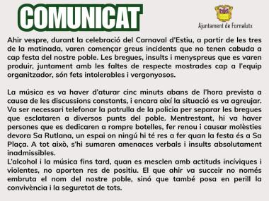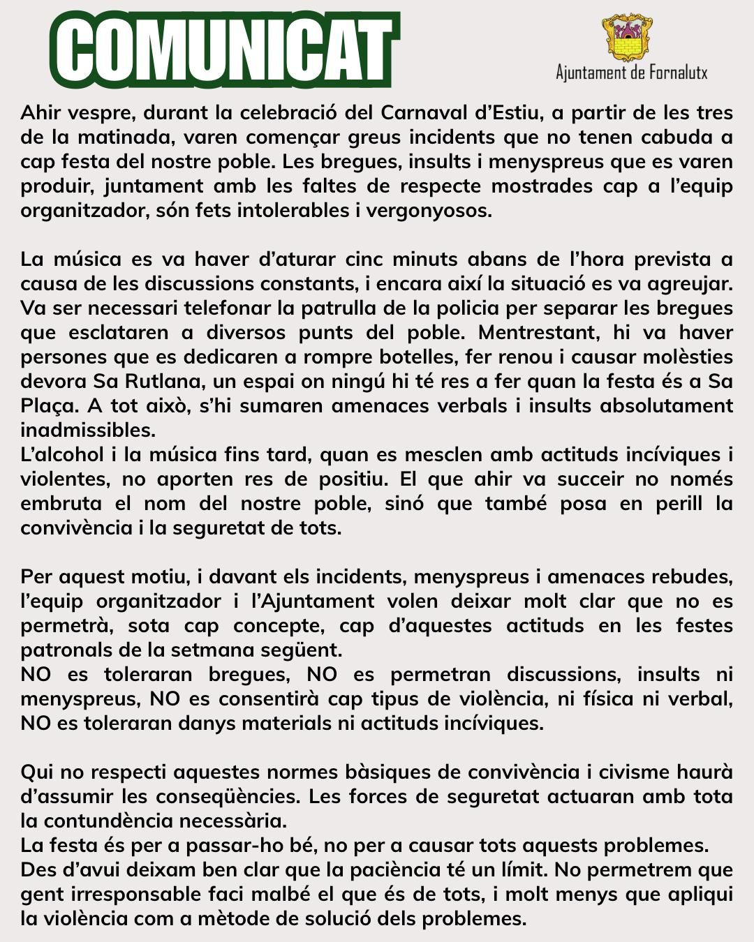 Després dels incidents d’ahir, l’equip de l’Ajuntament té clar que la setmana vinent a les festes patronals, el mínim incident que abasti violència o mal tracte, serà suficient per aturar la festa.